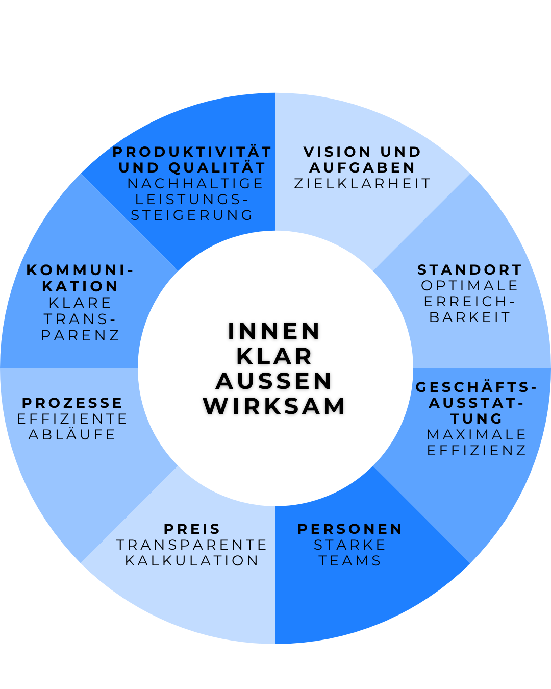 Die 8 Blickwinkel bilden kein starres Modell, sondern ein strukturiertes Denkgerüst. Ich habe sie aus dem erweiterten Marketing-Mix abgeleitet und speziell auf Planer und Unternehmer angepasst. Sie helfen dabei, die Strukturen eines Betriebs gezielt zu beurteilen, Schwächen sichtbar zu machen und an den richtigen Hebeln anzusetzen.