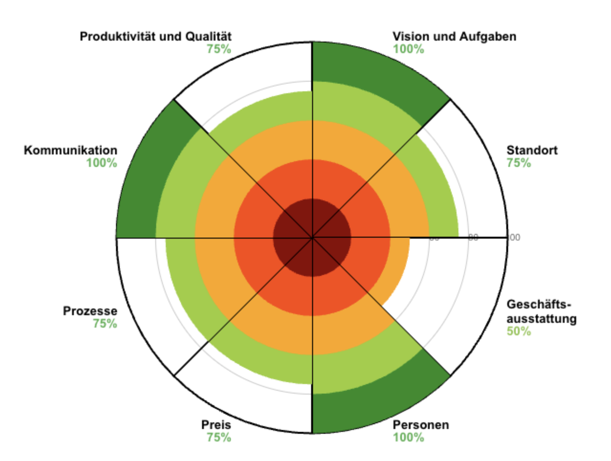Der Test dauert etwa 10–15 Minuten. Du beantwortest 32 Fragen, jeweils vier Fragen pro Blickwinkel. Das Ergebnis ist ein visuelles Unternehmensrad, das Deine Stärken und Potenziale auf einen Blick sichtbar macht.